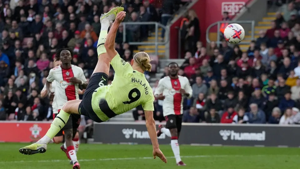 Haaland’s second goal, an outrageous bicycle kick after latching onto Jack Grealish’s cross, took his total to 30 goals scored in the Premier League this season, a haul the 22-year-old has reached in just 27 games and faster than anyone else.