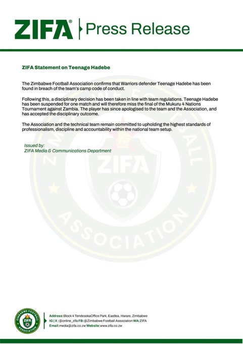 Zimbabwe will be without the services of veteran defender Teenage Hadebe for the highly anticipated Mukuru 4 Nations final against Zambia following a breach of the national team’s code of conduct.